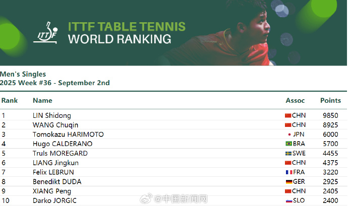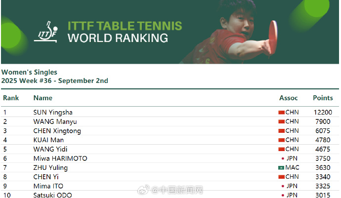 9月2日,国际乒联公布2025年第36周排名。女单:孙颖莎、王曼昱、陈幸同、蒯曼、王艺迪位列前五数魅优配,陈熠第8。男单:林诗栋、王楚钦位列前二,梁靖崑位列第6,向鹏位列第9。
