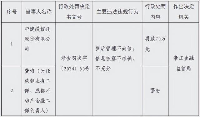 据国家金融监管总局对外披露,中建投信托因“贷后管理不到位,信息披露不准确、不充分”主要违法违规行为被浙江金融监管局处罚70万元。
